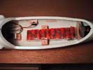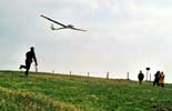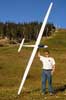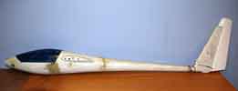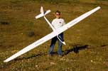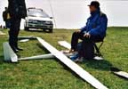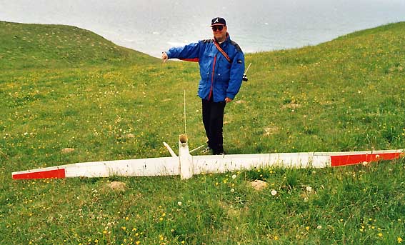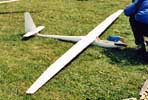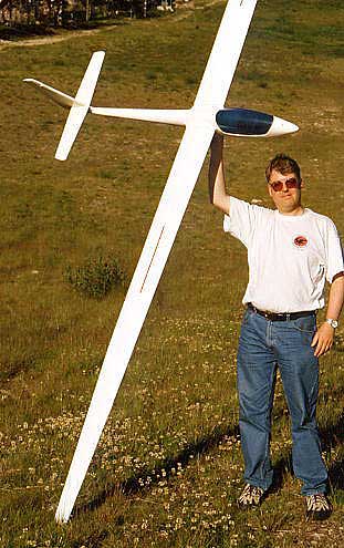 Den är nu "provflugen". Flygningen blev bara knappt 1 minut lång. Det hela utspelade sig på Hammars Backar i Skåne. Hanget är 40 meter högt och det båste ca 13-14 m/s snett från höger. Modellen kastades ut fint rakt mot vinden utan motor igång. Den var lite långsam. Jag fick trimma en hel del dyk. Trots det kändes det som om den flög långsamt. Modellen gled sakta åt vänster och ca 100 meter bort började jag en sväng tillbaka åt höger. Då vek sig modellen över höger vinge. Den rollade till inverterat läge och dök med en halv looping rakt in mot hanget. Nu försvann den ur sikte bakom hangkanten för att ett par sekunder senare komma farande upp över kanten i medvinden. Modellen vek sig nu över vänster vinge och krashade uppe på hanget. Kroppen gick i tre delar och vingarna blev bara skot. Motor, reglage och acke verkar ha klarat sig. Kroppen går att laga med tålamod. På vingarna är det bara bromsarna som kan återanvändas. Ett nytt byggprojekt för vintern 2001-2002. Jippi! ;-)