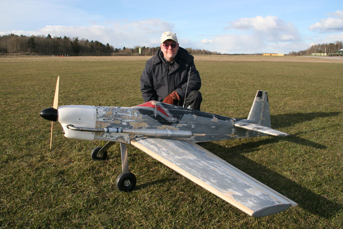 070417: Åkte till Barkarby för premiärflygning. Motorn gick oroligt på fullgas. Jag trodde bara att det berodde på att motorn inte var inkörd än. Efter lite skruvande på förgasarn så bar det iväg längs startbanan. Så fort modellen kom i luften så gick motorn sämre igen. Flög omkring en stund och kände på hur kärran uppförde sig. Den var mycket stabil och gick rakt dit man pekade den. Sedan stannade motorn. Var på hygglig höjd så dök ner modellen för landning. Kom in bra men med mycket fart då jag inte hade klaffat. Modellen tog mark mitt på banan och rullade ca 50 förbi banänden. Modellen klarade sig utan skada. Skruvade lite mer på motorn och skickade upp modellen igen. Motorn gick fortfarande dåligt dock stannade den inte. Också iandra landningen hade modellen hög fart så jag försökte minska den genom att svänga i slutet av banan. Modellen hoppade på högra hjulet i sidled innan den stannade. Landningstället blev krökt. Sedan gav jag upp och åkte hem.