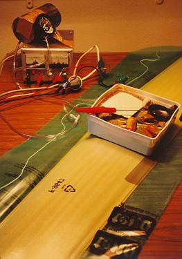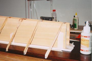 Vingen gjorde jag i tre delar. Mittsektionen är 80 cm med en konstant korda på 20 cm. Vingspetsarna är 60 cm så att hela vingen blir 2 meter. Kordan på vingspetsarna är 20 cm avsmalnande till 16 cm i spetsen. Vingen är gjord i frogolit och plankad med abachifaner. Balkens tvärsnitt är ett uppochnervänt T i kolfiber och plywood. Plankningen limmades med polyuretanlim som vakuumsögs under härdningen. Vingen är klädd med gul Monokote klädsel. Vingens blev lite tung med stark, 630 gram jämfört med 320 gram för originalet.
