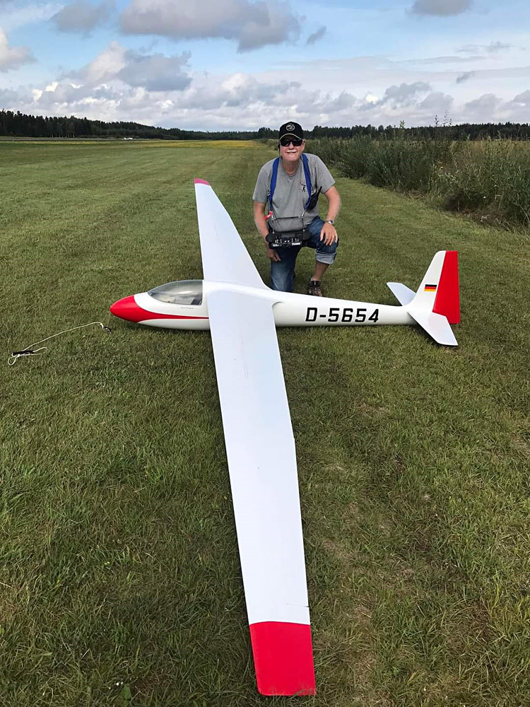 2019-06-15: Premiären är avklarad. Det gick bra. Efter justering av tyngdpunkt o trimning så flyger den väldigt trevligt. Lite seg på skeven men sidorodret tar desto bättre. Jag hittade dock ytterligare en klen detalj på modellen; hjulet. Fälgen blev skev. Den tål inte någon större sidobelasting på hjulet. Ett nytt stabilt Fema-hjul är beställt.