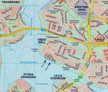 Telefonkarta sidan 36, C7. Åk till Snoilskyvägen. Nedanför vägen finns klipporna som utgör hanget. Nedanför hanget är det bara vatten. Buss 62 från T-banestation Fridhemsplan. Klicka på kartan för en större version. |