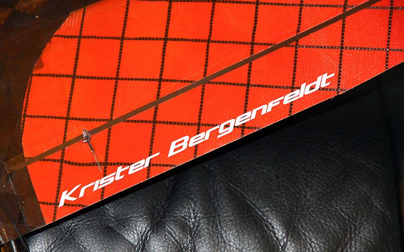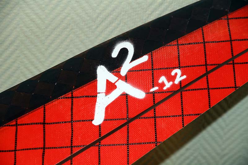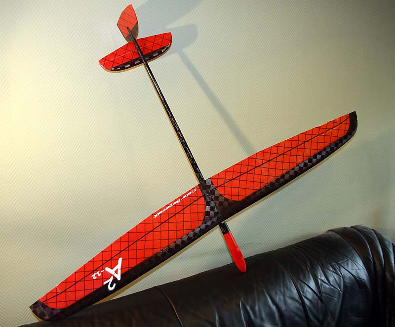 A2:an köpte jag från Andreas som tillverkar modellen. Vingen, fenan och stabben är rosa cellplast vakuum-sugen med kolfiber/glasfiberväv och epoxi. Snyggt jobb. Skarvar mellan vävar känns dock på ytan men det är svårt att undvika med detta byggsätt. Kroppen är gjuten i form. Styrning sker med höjd och skev. Mitt namn hade Andreas satt på innan leverans.