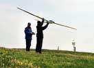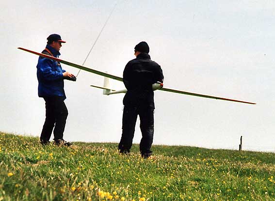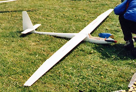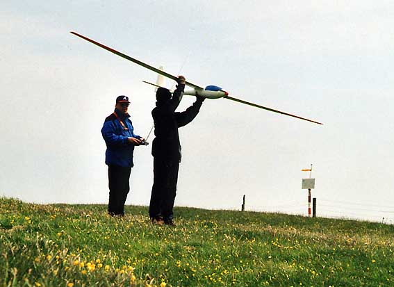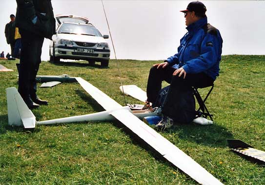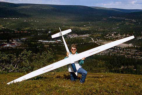 Den är nu "provflugen". Flygningen blev bara knappt 1 minut lång. Det hela utspelade sig på Hammars Backar i Skåne. Hanget är 40 meter högt och det båste ca 13-14 m/s snett från höger. Modellen kastades ut fint rakt mot vinden utan motor igång. Den var lite långsam. Jag fick trimma en hel del dyk. Trots det kändes det som om den flög långsamt. Modellen gled sakta åt vänster och ca 100 meter bort började jag en sväng tillbaka åt höger. Då vek sig modellen över höger vinge. Den rollade till inverterat läge och dök med en halv looping rakt in mot hanget. Nu försvann den ur sikte bakom hangkanten för att ett par sekunder senare komma farande upp över kanten i medvinden. Modellen vek sig nu över vänster vinge och krashade uppe på hanget. Kroppen gick i tre delar och vingarna blev bara skot. Motor, reglage och acke verkar ha klarat sig. Kroppen går att laga med tålamod. På vingarna är det bara bromsarna som kan återanvändas. Ett nytt byggprojekt för vintern 2001-2002. Jippi! ;-)