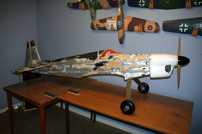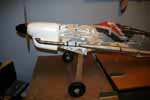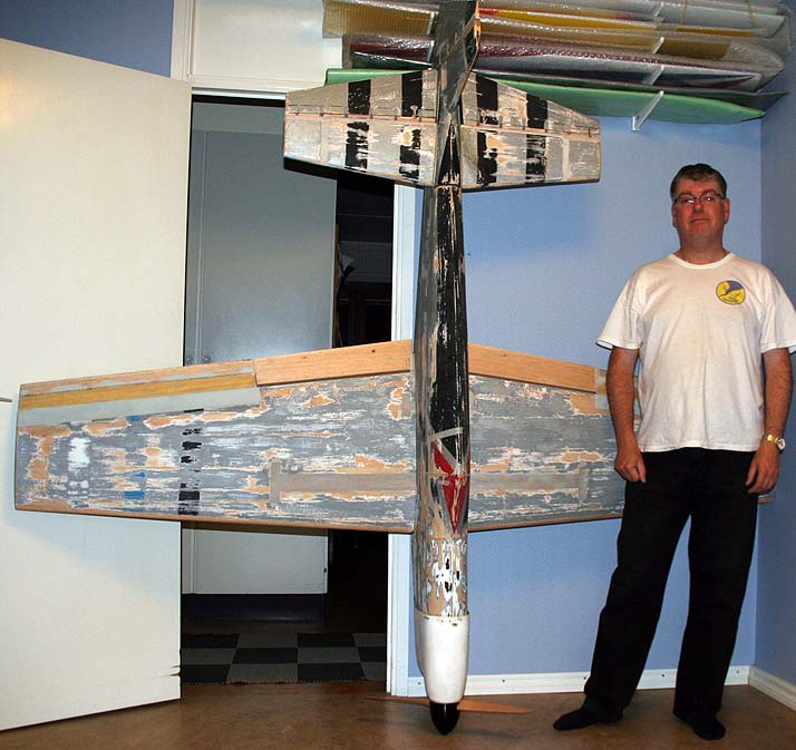 070417: Åkte till Barkarby för premiärflygning. Motorn gick oroligt på fullgas. Jag trodde bara att det berodde på att motorn inte var inkörd än. Efter lite skruvande på förgasarn så bar det iväg längs startbanan. Så fort modellen kom i luften så gick motorn sämre igen. Flög omkring en stund och kände på hur kärran uppförde sig. Den var mycket stabil och gick rakt dit man pekade den. Sedan stannade motorn. Var på hygglig höjd så dök ner modellen för landning. Kom in bra men med mycket fart då jag inte hade klaffat. Modellen tog mark mitt på banan och rullade ca 50 förbi banänden. Modellen klarade sig utan skada. Skruvade lite mer på motorn och skickade upp modellen igen. Motorn gick fortfarande dåligt dock stannade den inte. Också iandra landningen hade modellen hög fart så jag försökte minska den genom att svänga i slutet av banan. Modellen hoppade på högra hjulet i sidled innan den stannade. Landningstället blev krökt. Sedan gav jag upp och åkte hem.