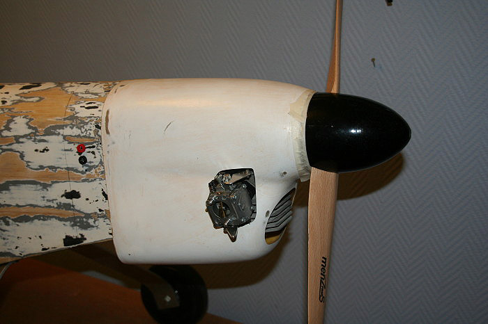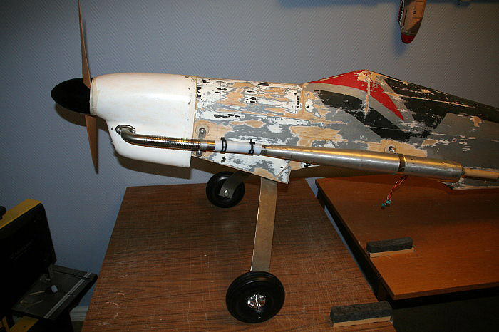 070305: Efter prov med avvägning av tyngdpunkten så insåg jag att motorn måste fram lite. Ett nytt motorspant tillverkades och fästes 5 cm framför det gamla spantet mha fem gängade stänger. Acken till tändsystem fästes på baksidan av det nya motorspantet och tändsystem på baksidan av det gamla spantet. Pipan är på plats och avgaskröken har lötts ihop med avgasflänsen som skruvas fast på motorn. Kåpan har fått hål för avgassystemet och förgasaren.
