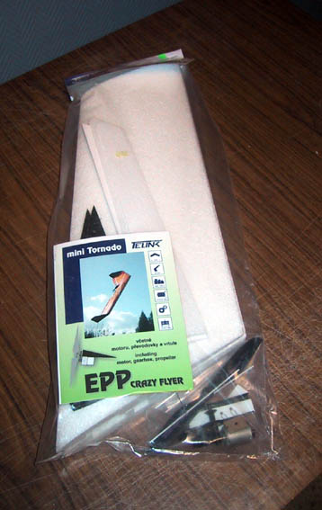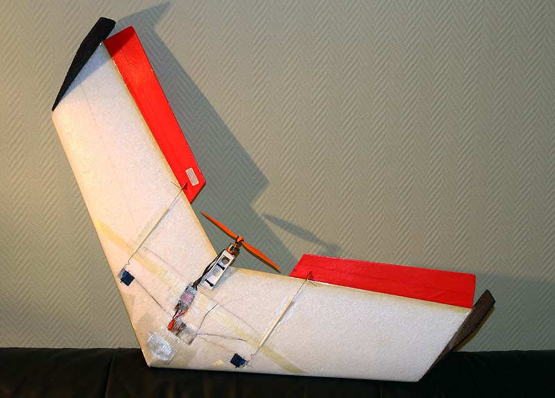 Flygande vinge med eldrift. Vingen är gjord helt i EPP förutom roderna som är vit frigolit. Vingen är förbered med utskurna hål för mottagare, servon, ackpaket och fartreglage. Konstigt nog har man gjort alla hål på undersidan av modellen. Det betyder att servoarmar och roderhorn kommer att var det första som tar i marken när man landar. Det kommer med all sannolikhet förstöra växellådan i de små servona som behövs till modellen. Jag byggde därför om vingen och monterade servona och mottagaren på ovansidan istället. Ingen klädsel används endast ett par förstärkningar av glasfibertejp.
