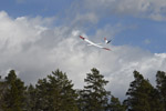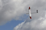 2020-04-10: Nu är modellen premiärflugen. Allt gick mycket bra. Vädret var fint med blå himmel och stackmoln men mycket turbulent, som det brukar vara på våren. Modellen kändes lite orolig. Jag fick vara aktiv och korrigera nästan hela tiden. Det mesta av det oroliga berodde på vädret. När det blev mer mulet under dagen minskade turbulensen och modellen var nu mer lugn. Nu var det inga problem att ligga tajt och kurva i små blåsor. Den behöver ordentligt med sidoroder för att hålla ner nosen när man kurvar så att man inte tappar fart. Ytterligare flygning dagen efter befäster intrycket. Det ska bli kul att prova med barlast här näst.
