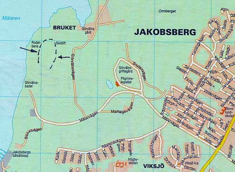 Telefonkarta sid 18, B2. Kör E18 mot Enköping, sväng av mot Jakobsberg Centrum, Sväng vänster under E18 och höger vid i nästa korsning in på Unionvägen. Tag vänster in på Viksjöleden i nästa korsning. Fortsätt viksjöleden över järnvägen och sväng höger in på Mälarvägen (skyltat Görväln). Fortsätt förbi kyrkogården och sväng höger in på Görvälnsvägen (skyltat slalombacke). Parkera på den stora parkeringplatsen. Klicka på kartan för en större version. |