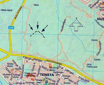 Telefonkarta sidan 27, C2. Kör E18 norrut, vid Hjulstakorset tag höger inpå Akallavägen och direkt höger till grusväg. Det är skyltat "Järva Disc Golf Park". Forsätt fram till parkering söder om kullen. Sedan är det 150 meter kvar upp till toppen. Granholmstoppen ligger cirka 1 km promenad från T-banestation Hjulsta. Klicka på kartan för en större version. |